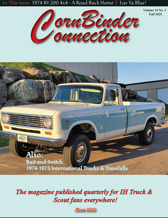 Welcome to our website featuring Cornbinder Connection, the magazine dedicated to covering ALL IH trucks & Scouts, including medium and heavy-duty over the road trucks, Pickups, Scouts, Travelalls, Travelettes and Wagonmasters. Cornbinder Connection is a quarterly, full-color publication covering all aspects of IH Trucks, from history and restoration stories to maintenance tips and general information, upcoming IH events and more. We welcome your stories, letters and photos of anything IH truck and Scout related for potential inclusion in the magazine. Our Fall 2025 issue is pictured at left and is the current issue until Dec. 31st.